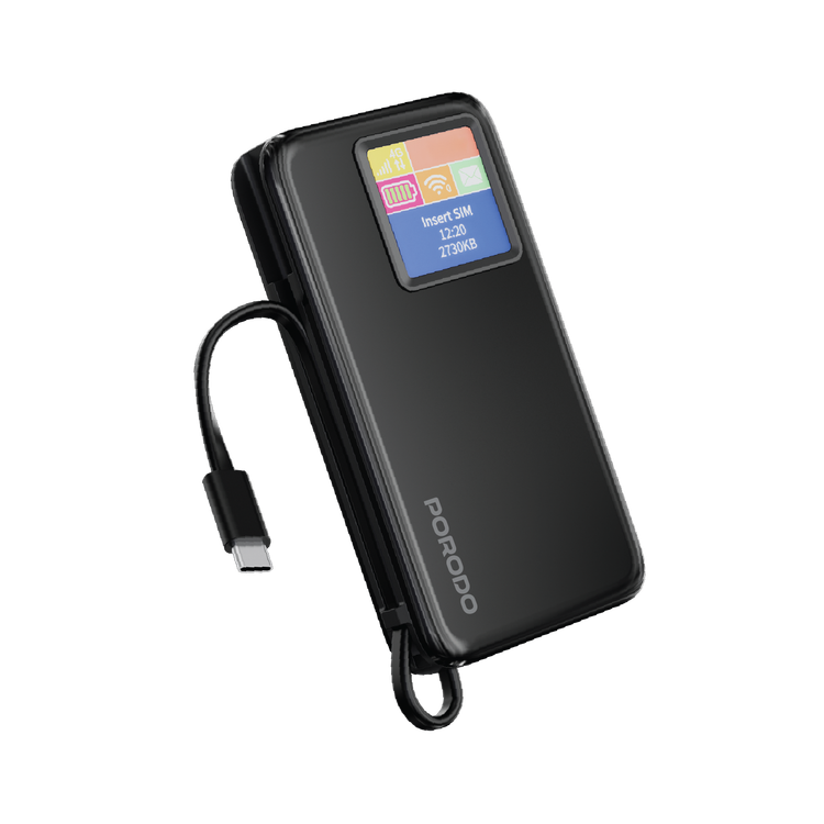 Porodo 4G LTE & Wi-Fi 6 PB087 Pocket Router with 10000mAh Power Bank, 4G LTE Wireless Technology, 15W Max Total Output, 16 Maximum Users, 26 Hours Working Time, Nano SIM Card Slot, 300Mbps TDD-LTE Speed, Fast & Reliable Connectivity, Secure Encryption, TSA Approved - Black