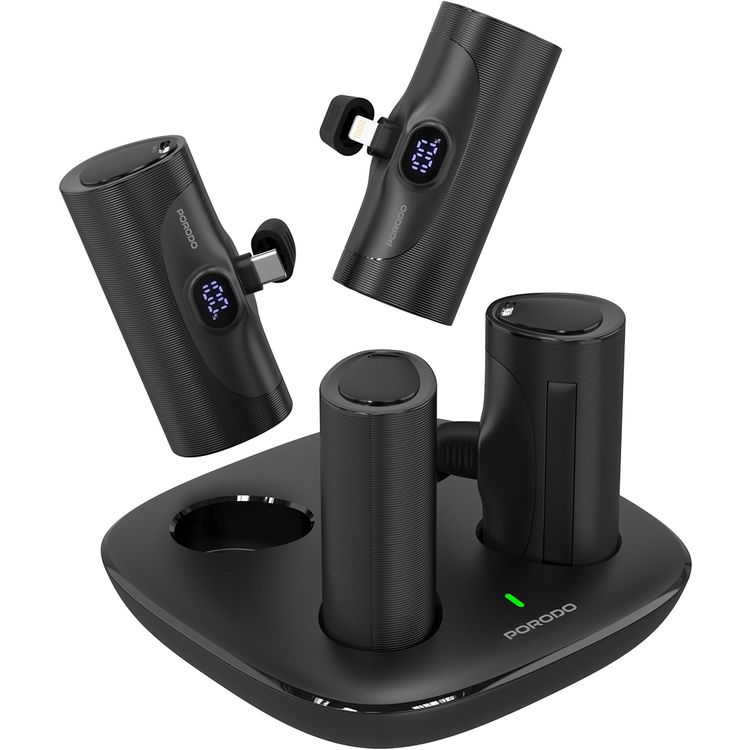 Porodo 5000mAh 4 in 1 Power Bank Station with Dual Lightning and Type-C Integrated Connectors, 20W PD, Portable, Integrated Kickstand, LED Digital Display - Black