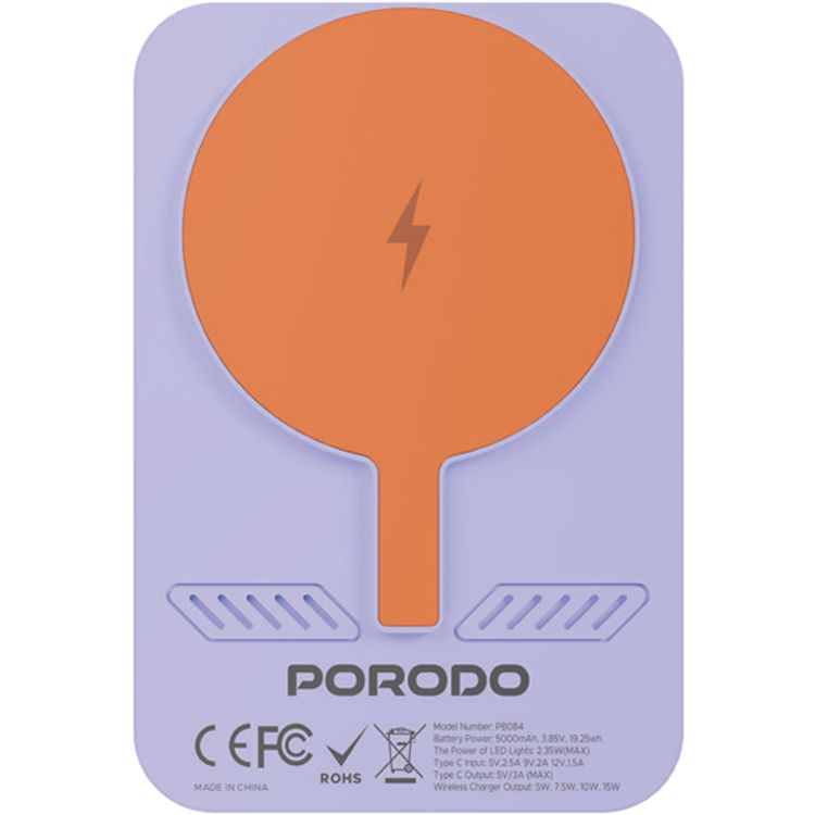 Porodo 5000mAh MagSafe Power Bank with Built-in Mirror, 18W USB-C Input, 15W USB-C Output, 3 Light modes, Up to 15W Wireless Output, Portable & Compact Design - Purple
