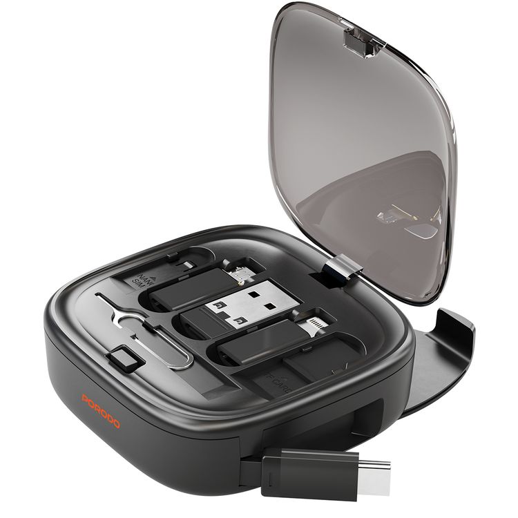Porodo Multi-Device Charging Kit with Built-in Phone Holder, Retractable Type-C Cable, 60W Power Delivery, USB-A, Micro USB & Lightning Adapters, TF & Sim Card Slots - Black