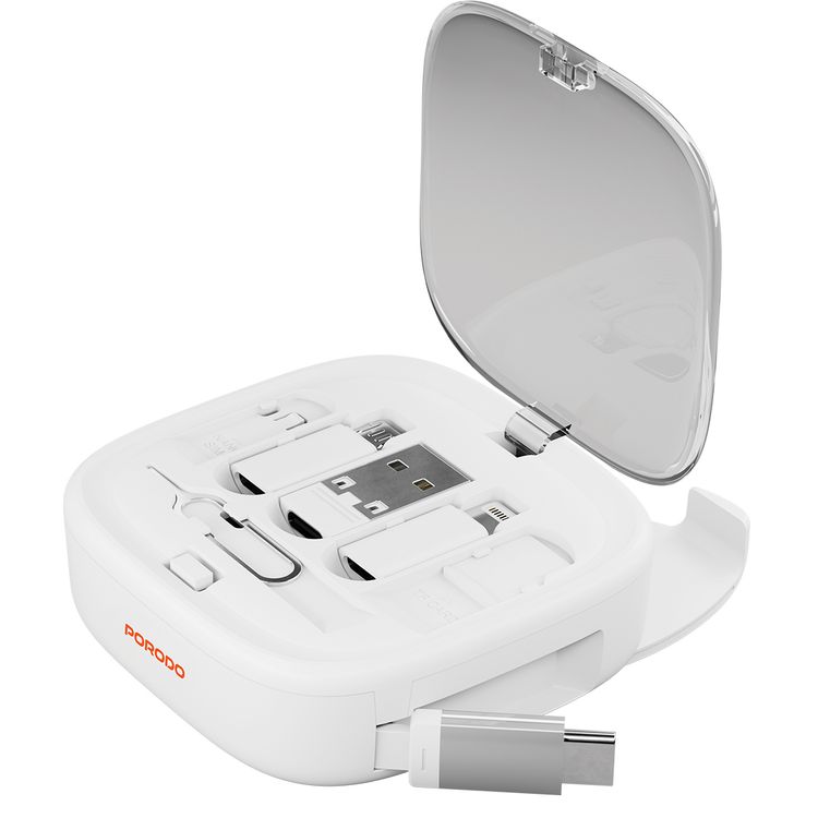 Porodo Multi-Device Charging Kit with Built-in Phone Holder, Retractable Type-C Cable, 60W Power Delivery, USB-A, Micro USB & Lightning Adapters, TF & Sim Card Slots - White