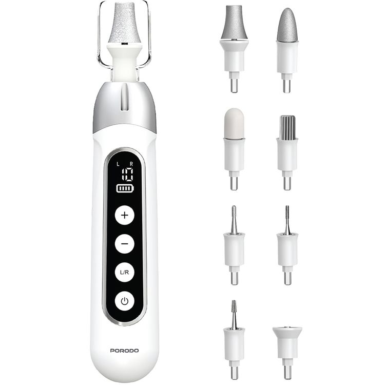Porodo 8-IN-1 Rechargeable Electric Nail Drill with Forward & Reverse Rotation, Manicure and Pedicure, Built-in LED Light, Remove Calluses & Dead Skin, 3 Hours Working Time - White