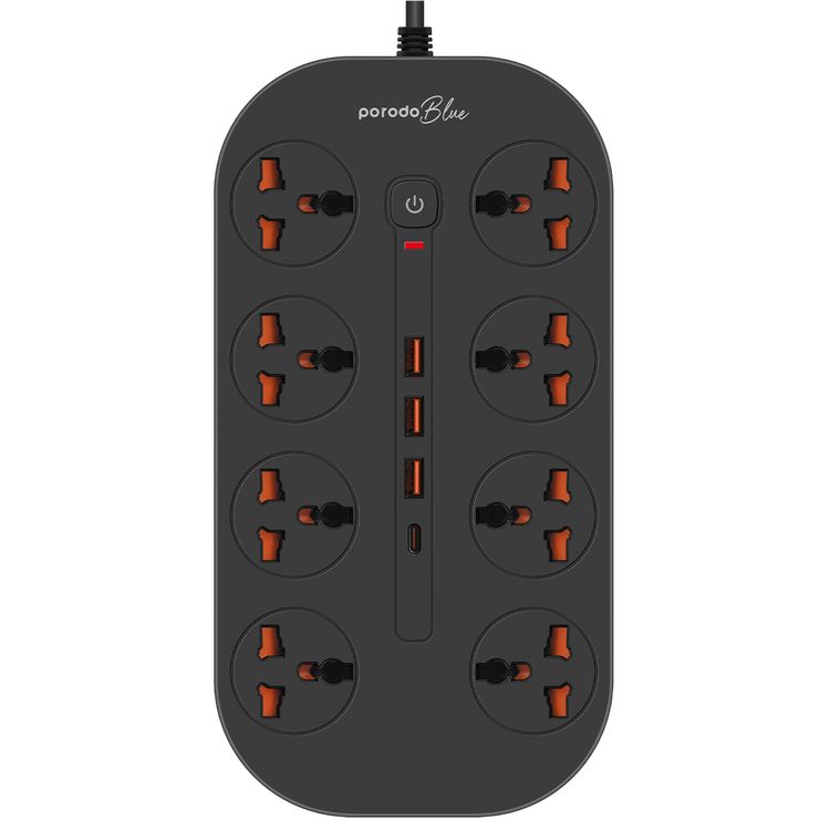 Porodo 8AC Universal Power Strip with Premium Materials, Safety Shutters, 13A Maximum Current, 3m Cable Length - Black