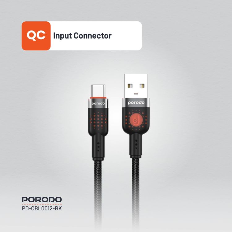 Porodo Braided USB-A to Type-C Cable with 480Mbps Transfer Speed, 1.2m Cable Length, More than 15,000 Bends Lifespan, Tangle-Free Design - Black
