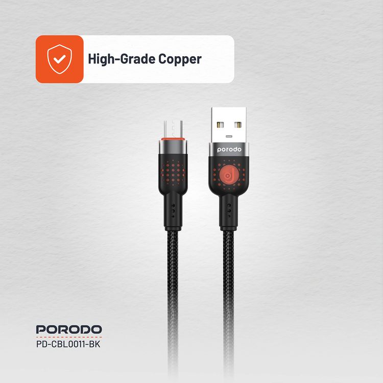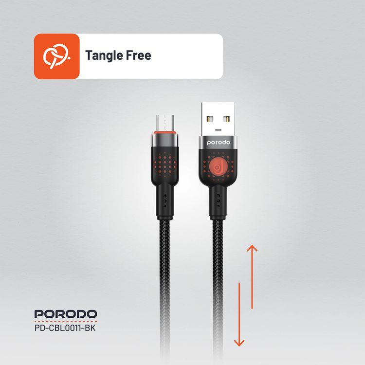 Porodo Braided USB-A to Micro USB Cable with 480Mbps Transfer Speed, 1.2m Cable Length, More than 15,000 Bends Lifespan, Tangle-Free Design - Black