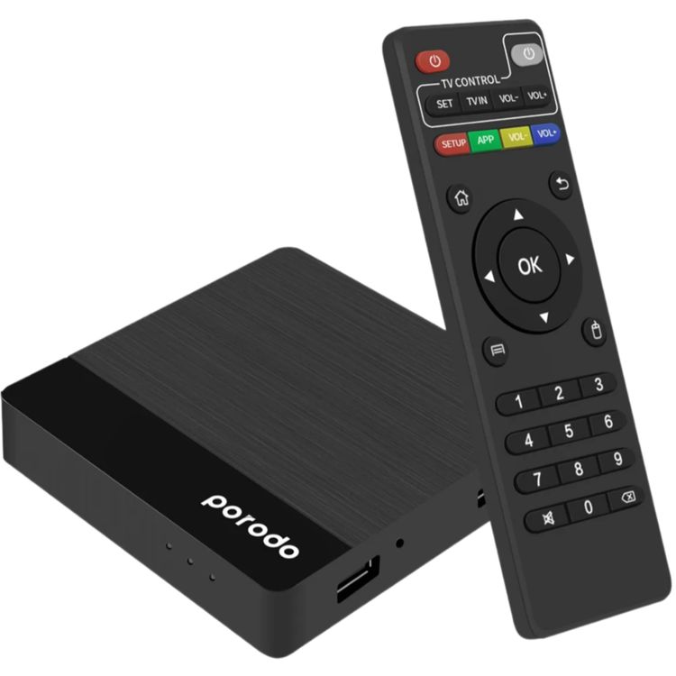 Porodo Android TV Box Video Streaming with 1080P Full HD, 8GB Storage, 1GB RAM, Quad-Core, HDMI, 2× USB 2.0, RJ45, AV Output, Unlimited Streaming, UK 3-Pin Power Plug - Black