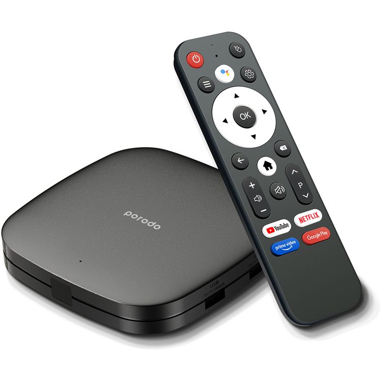 Porodo Android TV Box, Video Streaming, 2GB RAM, 8GB ROM, Voice Command, Quad-Core, 4K Ultra HD, Android 9.0, Unlimited Streaming - Black
