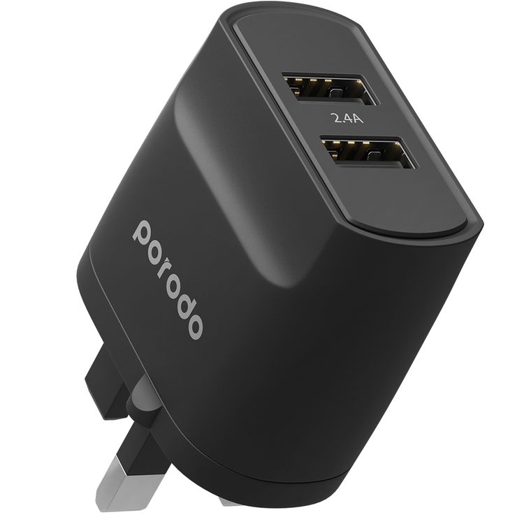 Porodo Blue Dual Port Wall Charger 2.4A with Fireproof Material, UK 3-Pin Plug, Overheat Protection, Overheat Protection, 100-240V Input - Black