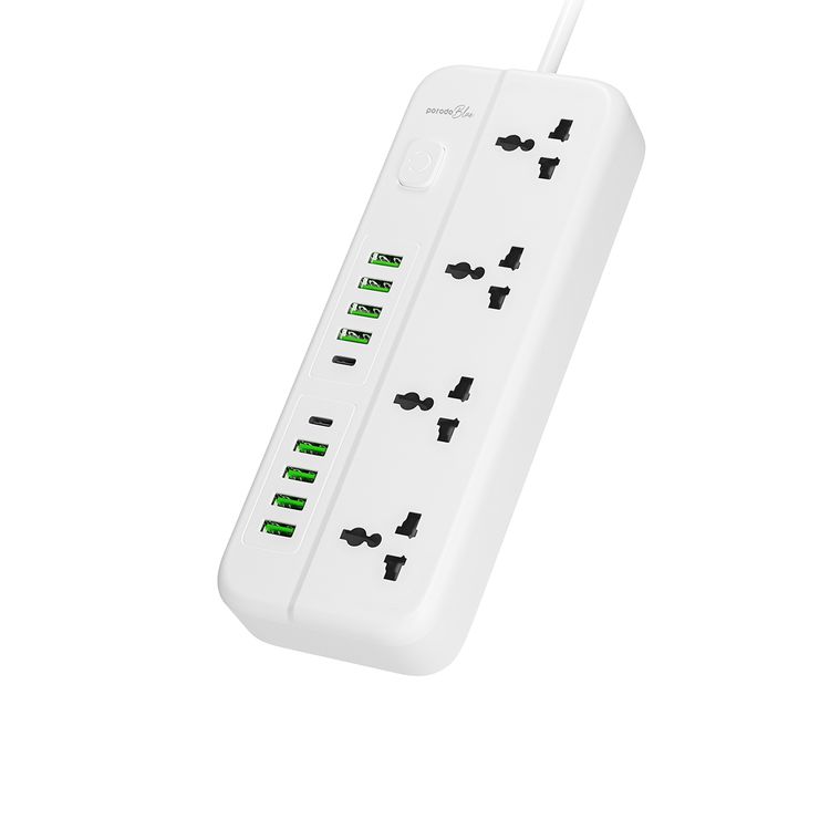 Porodo Blue Power Strip with 4 AC Sockets, Dual USB-C & 8 USB-A Ports, 3m Cable Length, 2000W AC Output, 3-Pin UK Plug, 10A Rated Current - White