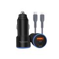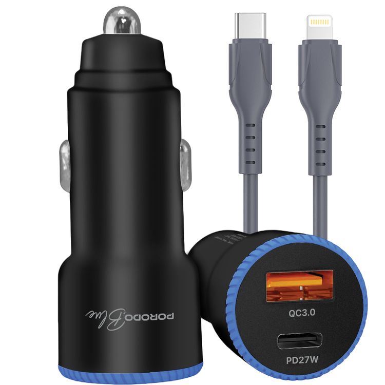 Porodo Blue Graz Dual USB Car Charger with Indicator Light, 27W USB-C to Lightning 1m Cable, PD 27W, QC 18W, Auto-Off Function, Simultaneous Charging, 12-24V Input Voltage - Black