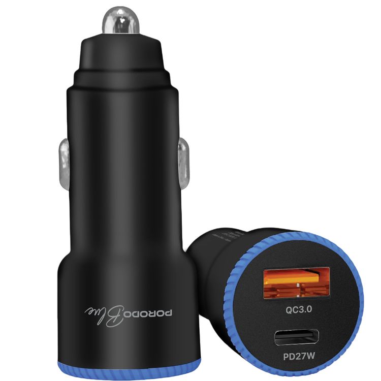 Porodo Blue Graz Dual USB Car Charger with Indicator Light, PD 27W, QC 18W, Auto-Off Function, Simultaneous Charging, 12-24V Input Voltage - Black