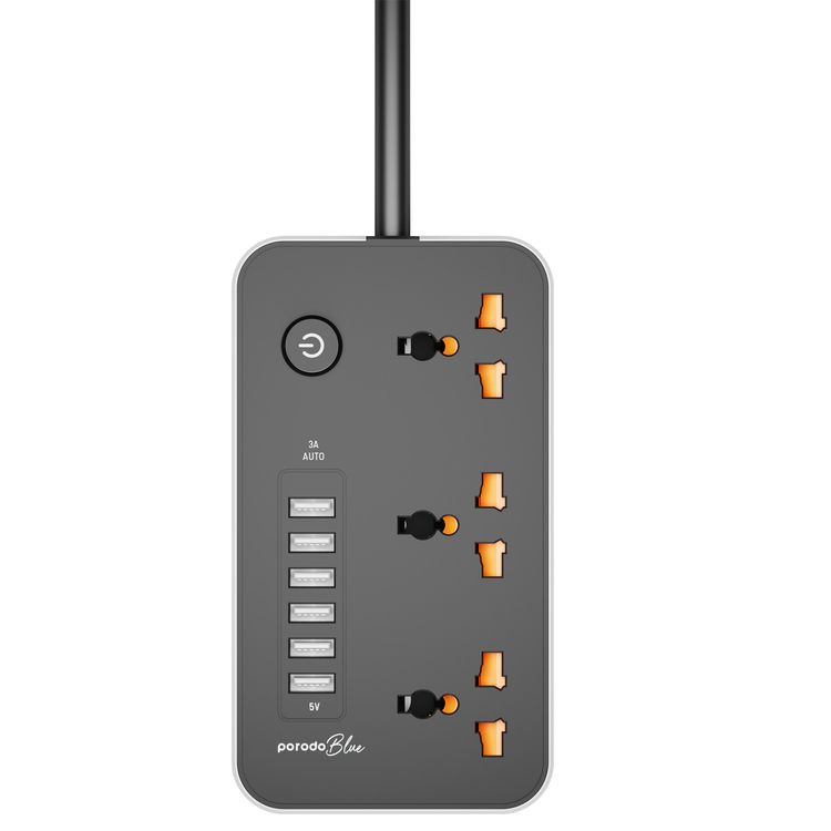 Porodo Blue Multi-Port Power Socket with, 2500W Rated Power, 5V/3A USB Output, X6 USB-A Ports, 2 meters cable - Black