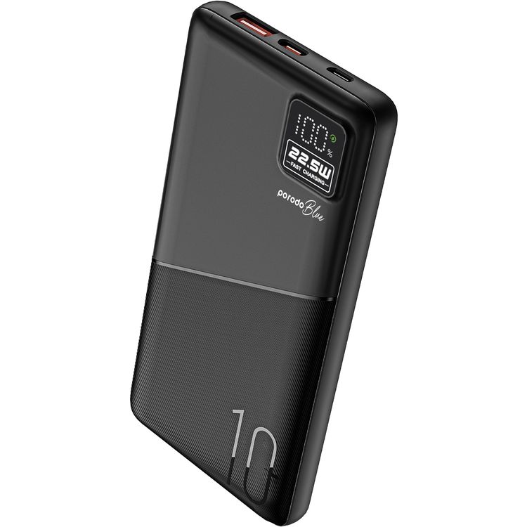 Porodo Blue Quick Charge Power Bank with USB-A & USB-C Outputs, 10000mAh Battery Capacity, Digital Display, 20W Power Delivery - Black