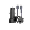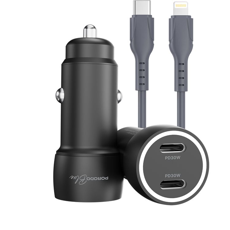 Porodo Blue Riva 60W Car Charger with PD30W USB-C to Lightning Cable, Auto-Off Function, Simultaneous Charging, Dual USB-C Ports, 12-14V Input Voltage, 60W Max Total Output - Black