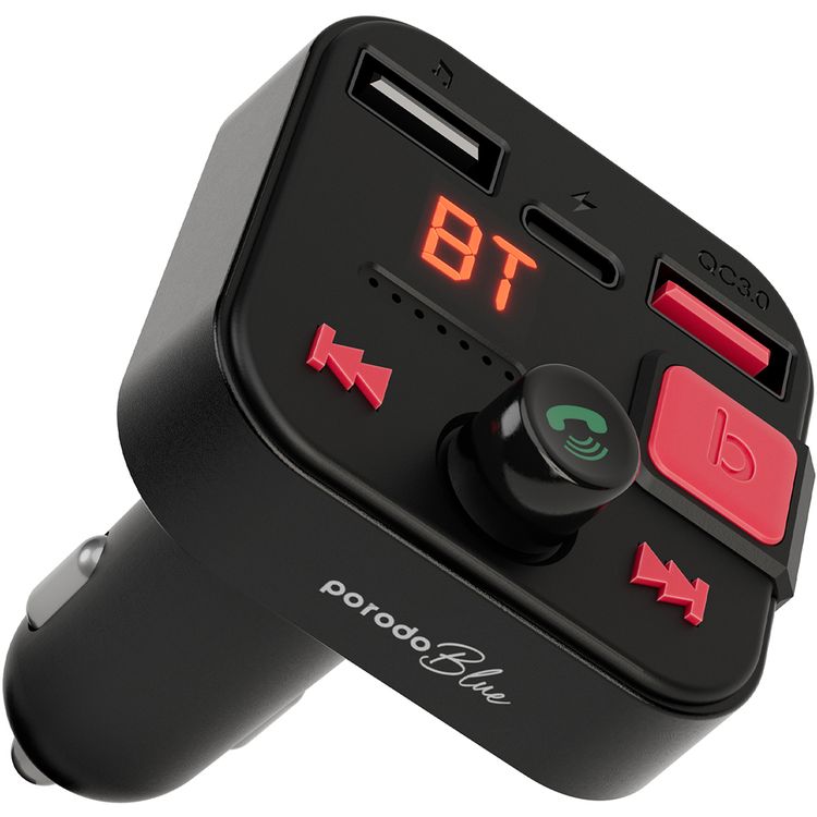 Porodo Blue Wireless FM Transmitter Car Charger with Dual QC3.0, USB-A & USB-C Ports, High-Quality Microphone, Bluetooth Version 5.1, 30W Total Power, 64GB Micro SD Slot, Hands-Free Calling, Music Streaming, Travel Friendly - Black