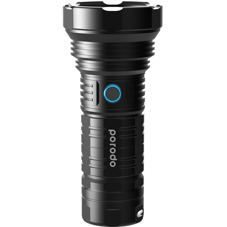 Porodo Camping Rechargeable LED Tactical Flashlight, 1800 Lumens Brightness, 6600mAh Battery Capacity, 6 Hours Charging Time, Up to 5 Hours Running Time, Type-C Charging Port - Black