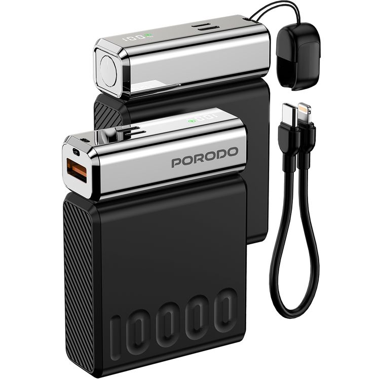 Porodo Chromevolt 10000mAh Power Bank with LED Digital Display, 35W PD Type-C & Lightning Outputs, 22.5W QC USB-A Output, Fast Charging Technology - Black