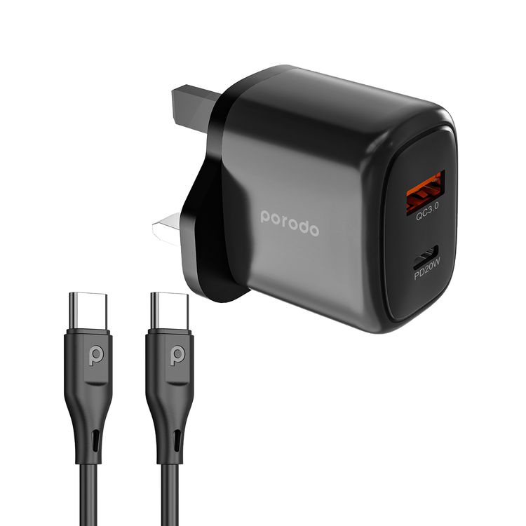 Porodo Dual Output Quick Charger with Type-C to Type-C Cable, 20W Power Delivery, QC 18W, UK 3-Pin Plug, Simultaneous Charging, Universal Compatibility - Black