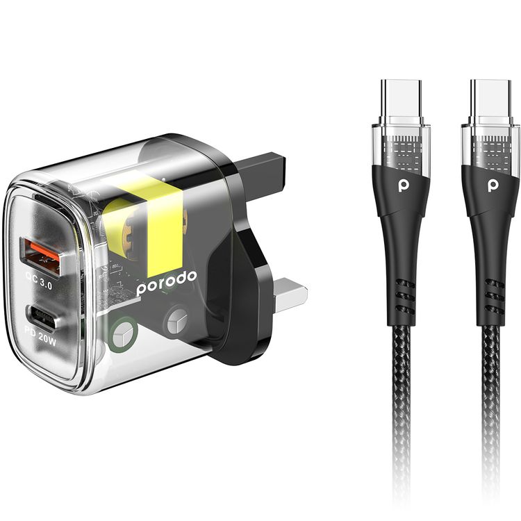 Porodo Dual Output Transparent Quick Charger with USB-C to USB-C Cable, 20W Power Delivery, Simultaneous Charging, 18W USB-A Output, 0%-60% Charge in 35 Minutes, Overheat Protection - Black