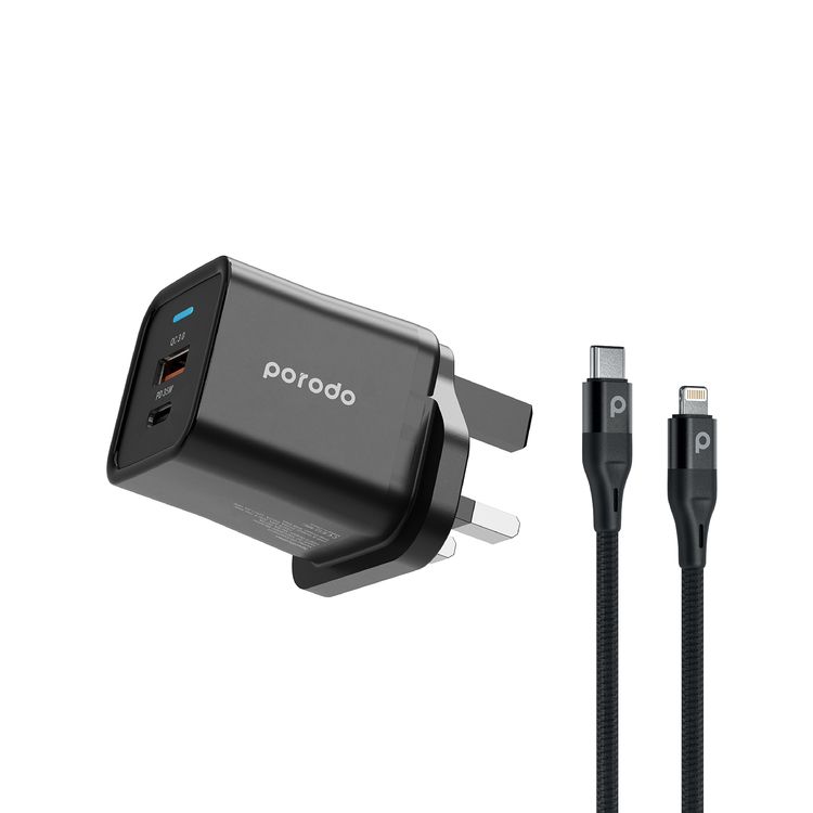 Porodo Dual Port PD Charger with Type-C to Lightning Cable, Fast Charging USB-C & USB-A Outputs, 35W Power Delivery, 18W USB-A Output, Overheat Protection, UK 3-Pin Plug - Black