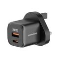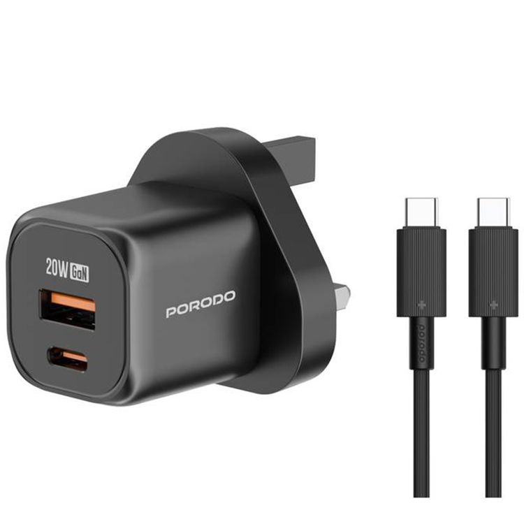Porodo Dual Port Wall Charger with USB-C to USB-C Cable, Over-Heat Protection, Simultaneous Charging, Reliable Companion - Black