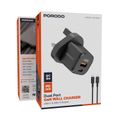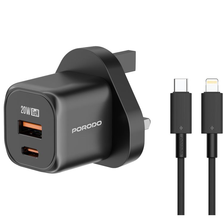 Porodo Dual Port Wall Charger with USB-C to Lightning Cable, Over-Heat Protection, Simultaneous Charging, Reliable Companion - Black