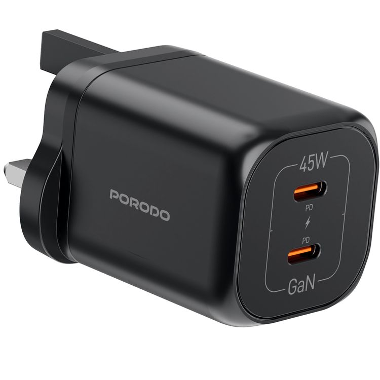 Porodo Dual USB-C Quick Wall Charger with 45W Power Delivery, 0.5A Maximum Rated Current, Built-in Safeguards, 3-Pin UK Plug, Simultaneous Charging, GaN Technology - Black