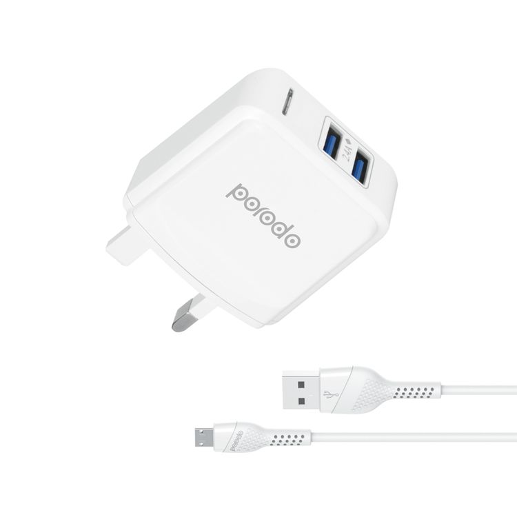 Porodo Dual USB Output Wall Charger with 1.2 m USB-A to Micro USB Cable, 12W Total Output Power, Overcharge & Overheat Protection, UK 3-Pin Plug, LED Indicator, Intelligent IC - White