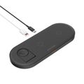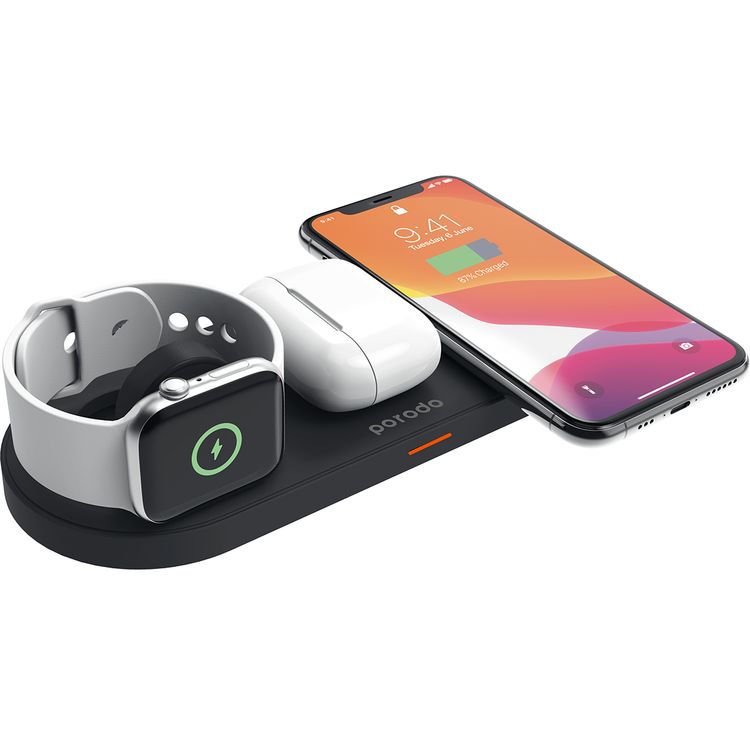 Porodo 4-in-1 Slim Charging Base with Built-in Foldable Watch Charger, Type-C Cable Included, Up to 10W Fast Wireless Charging, Overcharge & Overheat Protection - Black