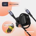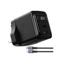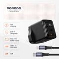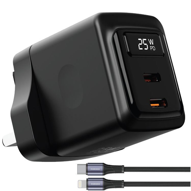 Porodo GaN Wall Charger with USB-C to Lightning Cable, Dual USB-C Ports, 25W Power Delivery, Built-in Safeguards, Fast Charge Support, Multiple Device Charging, Digital Display - Black
