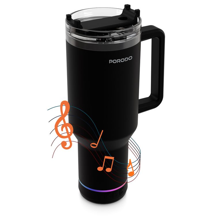 Porodo HydroTunes Tumbler with Detachable Bluetooth Speaker Base, Bluetooth Version 5.3, 300mAh Battery, 1.2L Capacity, USB-C Charging Port, Dual-Function Design, Leakproof Silicone Lid, 3W Speaker Output Power - Black