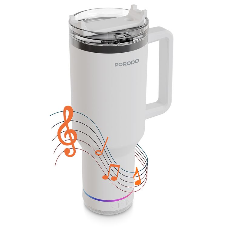 Porodo HydroTunes Tumbler with Detachable Bluetooth Speaker Base, Bluetooth Version 5.3, 300mAh Battery, 1.2L Capacity, USB-C Charging Port, Dual-Function Design, Leakproof Silicone Lid, 3W Speaker Output Power - White