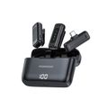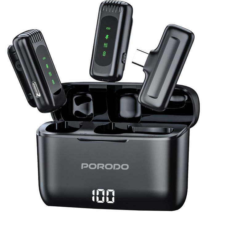 Porodo Lavalier Double Microphone with Charging Case, Up to 12 Hours Working Time, 300mAh Case Battery Capacity, 20ms Latency, 2.4GHz Microphone Frequency, Type-C Connector with Lightning Adapter, Digital Display, Low Latency, Crystal Clear Audio, Plug & Play - Black
