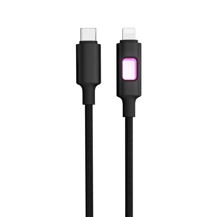Porodo LED Braided USB-C to Lightning Cable with 27W Power Delivery, 1.2m Cable Length, Tangle-Free Design, High-Speed Data Transfer, Fast Charging Speed, Superior Durability - Black
