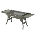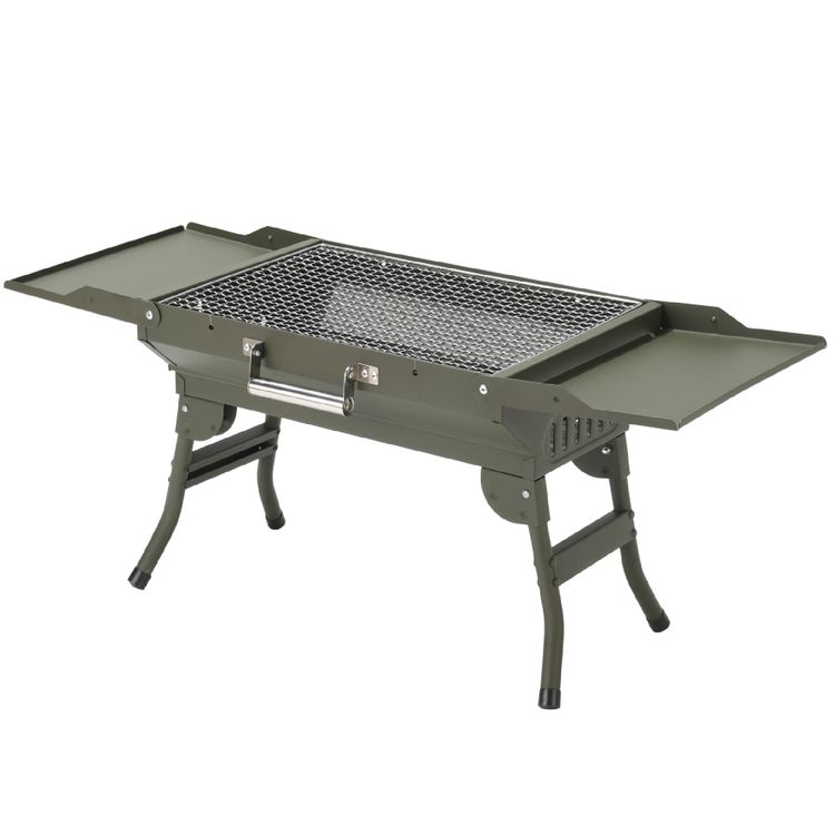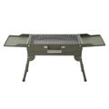 The Porodo Lifestyle Camping Portable Charcoal Grill/Carbon Oven, presented in an elegant green, is constructed from robust iron for durability. It offers a substantial grilling area with a 66x30cm baking net, set within a product size of 120x31x62cm, allowing for extensive cooking options. Included with the grill are practical accessories such as a grill pan, mesh grill wire, and tongs, adding to its versatility. The grill's solid base provides stability and safety, making it a perfect fit for those who enjoy outdoor grilling with a touch of sophistication.