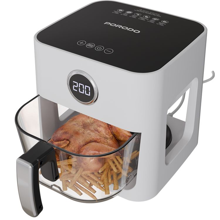 Porodo Lifestyle Glass Pot Air Fryer with 5L Capacity, Up to 60 Minutes Timer, 8 Presets, 360° Panoramic View, 1200W Rated Power, Food-Grade Glass Spot, Touch Panel - White
