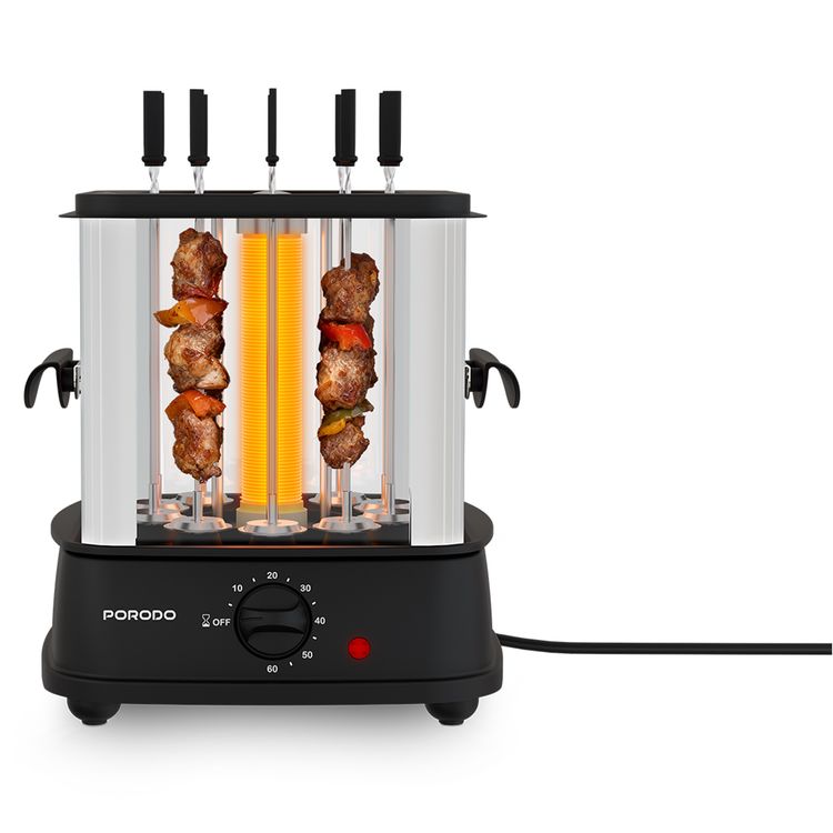 Porodo Lifestyle GrillJet Electric Rotisserie Kebab Grill with Timer, Auto-Rotating Skewers and Gears, Tempered Glass Cover, Removable Drip Tray, Auto Shut-Off Function, Anti-Slip Feet, 360°c Individual Skewer Rotation, Teflon Coated Tray - Black