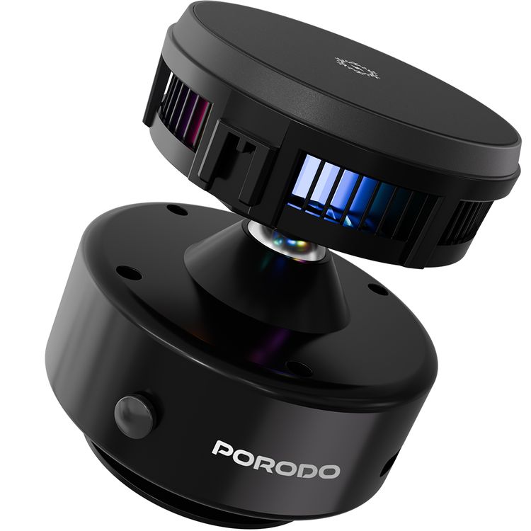 Porodo Lifestyle Vacuseal MagSafe Charging Mount with Cooling Semiconductor & RGB Light, Up to 25 Days Working Time, Adjustable Viewing Angle, 100mAh Battery Capacity, Up to 1.5kg Adsorption Capacity, Strong Suction, One-Hand Operation - Black