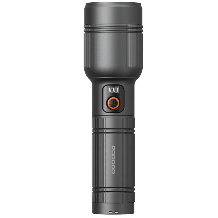 Porodo Lumalite 2600 Lumens Rechargeable Flashlight with Ultra-Bright Beam, 5000mAh Battery, 30W Rated Power, Up to 700m Coverage Area, USB-C Charging Port, 3.8 Hours Working Time, Manual Zoom Control, Multi-Mode Operation - Gray