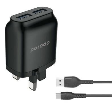 Porodo Dual Port UK Wall Charger with USB-A to Micro USB Cable, Fast Charging & Auto ID Support, 2.4A USB-A Current, Fireproof Material, Overheat Protection, Protective Safeguard - Black