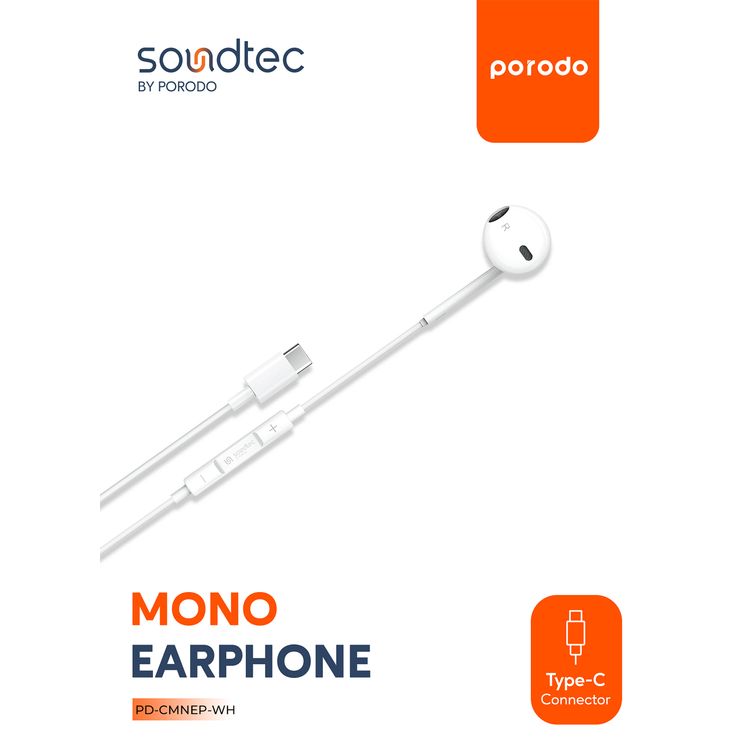 Porodo Soundtec Mono Earphone with Type-C Connector, 3-Button Controls, High-Clarity Microphone, 120 cm Cable Length - White
