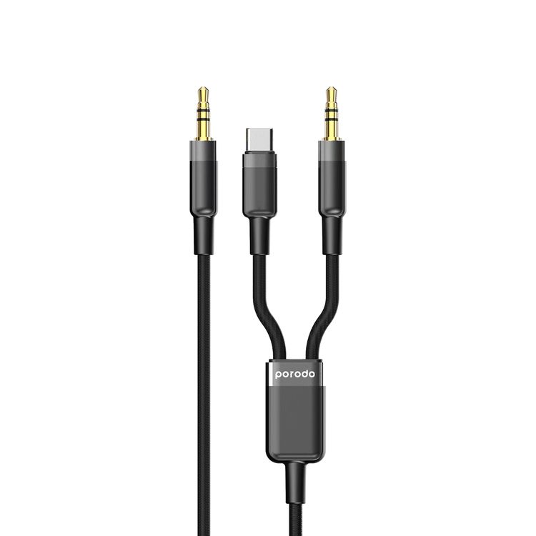 Porodo Multi-Device AUX Cable with AUX to 3.5mm Jack & USB-C Connectivity, 1.2m Cable Length, 15000+ Bends Lifetime, Tangle-Free Design - Black