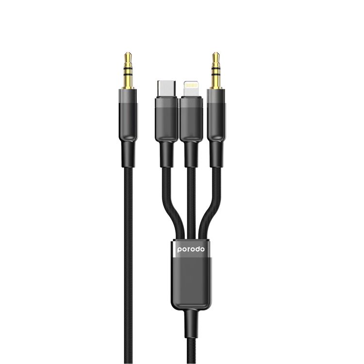 Porodo Multi-Device AUX 3.5mm Audio Cable with Type-C & Lightning & AUX Connector, 1.2m Cable Length, Aluminum Alloy & Braided Wire Material, Tangle Free - Black