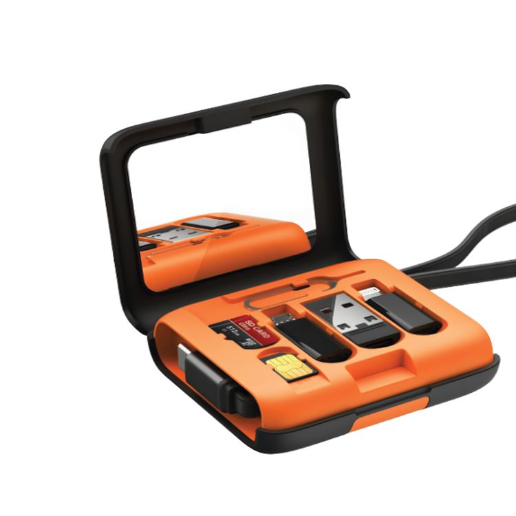 Porodo Multi-Functional Travel Data Cable Set with Built-in Phone Stand, USB-A, Lightning, Micro USB, Type-C Connectors, 2 SIM Card Slots & 1 TF Card Slot - Orange