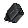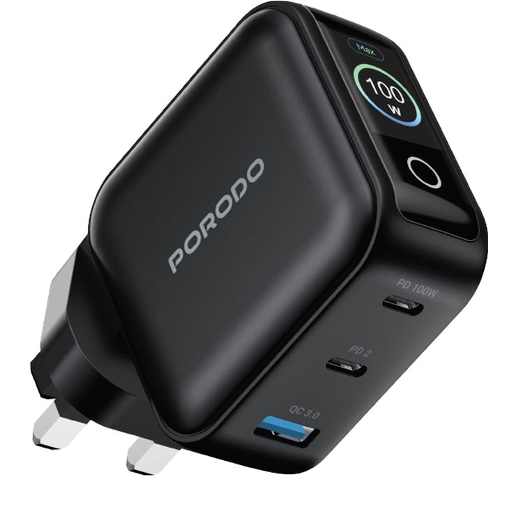Porodo Nexora 3-Port 100W Wall Charger with LCD Display, 100W Power Delivery, QC 30W, GaN Technology, 3-Pin UK Plug, Universal Compatibility, Multi-Device Charging - Black
