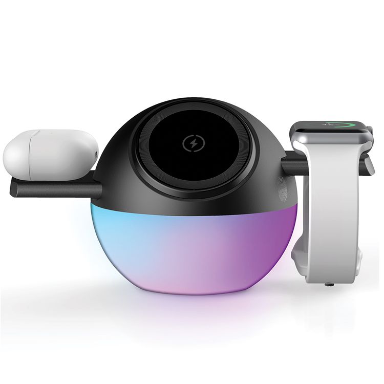 Porodo Orbix 3-in-1 Wireless Charger with Adjustable Ambient Light, 3-8mm Charging Distance, 15W Wireless Fast Charging, 5W Earbuds Output, 2.5W Watch Output, Type-C Charging Interface, Secure Magnetic Dock - Black
