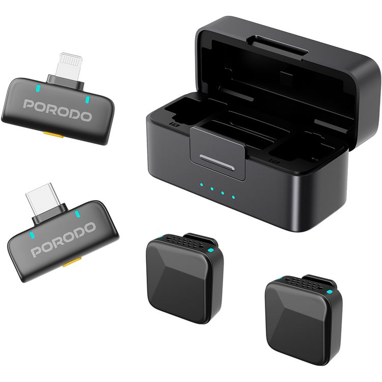 Porodo Orion Lavalier Dual Microphones with Type-C & Lightning Connector, Precise Reverb, 1 Hour Charging Time, 5 Hours Working Time, 650mAh Case Battery Capacity, 55mAh Microphone Battery Capacity, 15-20m Transmission Distance, Auto Pairing Technology, Instant Wireless Setup - Black