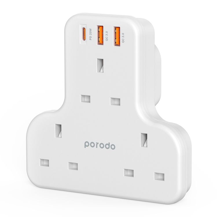 Porodo Multi-Port Wall Socket with 20W Power Delivery, Overheat & Overcharge Protection, UK 3-Pin Power Plug, 3250W AC Power, Fireproof Material, Smart Design - White