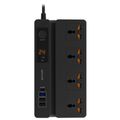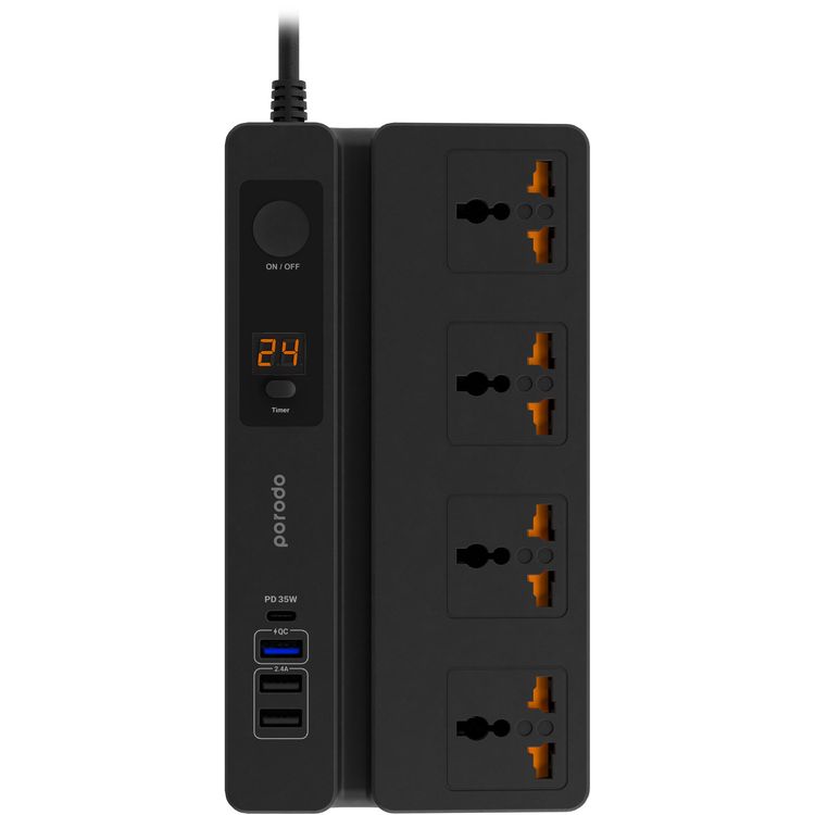 Porodo Universal Socket 4 AC/ x2 USB ports/ USB QC3.0/ USB-C PD.USB-C for charging Smartphones, tablets, laptops, headphones, or any kind of type-C device. There is a specific area, a phone stand at the middle which divides the plugs and USB ports in another hand, it improves your phone cable life because there is no pressure on it as long as you put your phone in this Phone Stand. Charging time in this product is from 0 to 60% in 35 minutes. It also has 24Hrs Timer and overload reset. The material is Made of Fire-resistance PC Shell & Conductivity Copper Cable that fully protects against overcharging, overheating, overvoltage, overcurrent, short-circuiting.