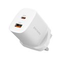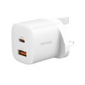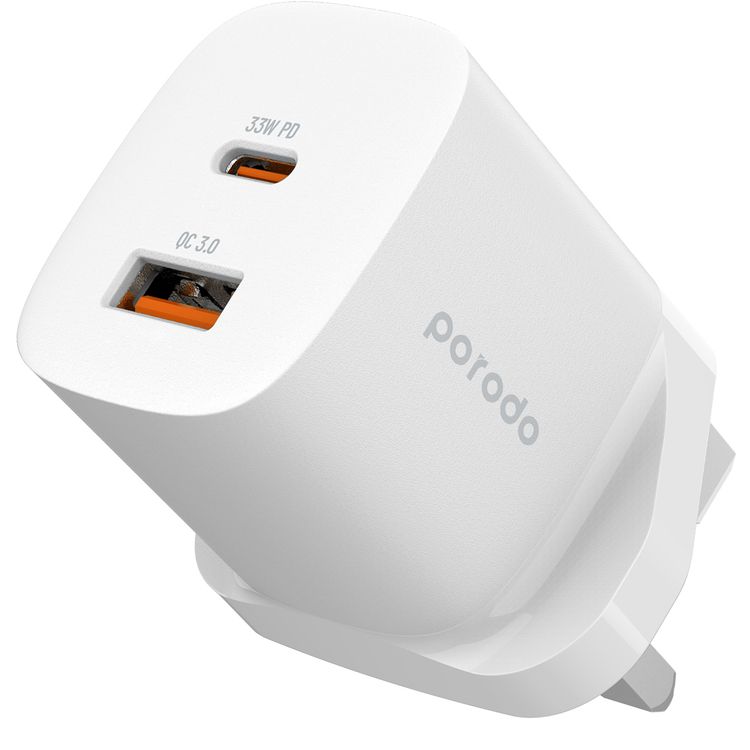 Porodo GaN Quick Charger Power Adapter with 33W Power Delivery, Simultaneous Charging, 30W USB-A Output, UK 3-Pin Plug, 0% to 60% Charge in 35 Minutes, Fast Charging Support - White